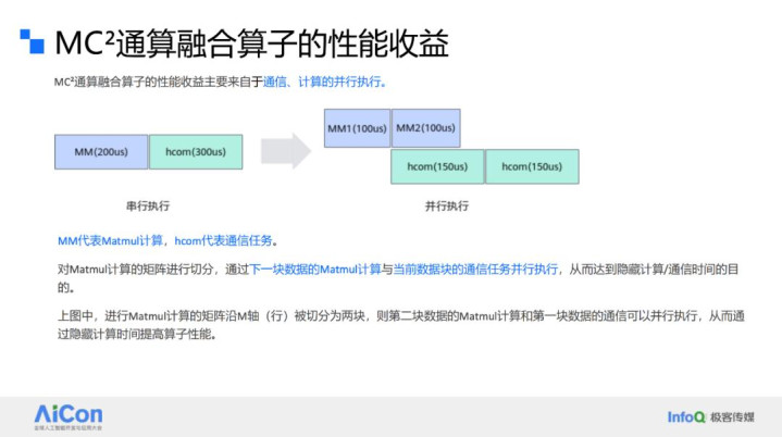 因此,分布式推理与分布式训练成为了必然选择。在实际应用中,混合并行策略,包括模型并行、数据并行和流水线并行,已被广泛应用于各种框架中。我们将并行计算与通信算子相结合,形成了所谓的通算融合,旨在通过计算和通信的流水并行来提升性能。在分布式推理和训练框架中,MC²的性能优化是一个关键挑战,核心在于如何平衡计算与通信。