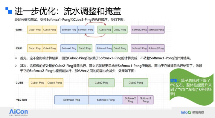 发现问题后,我们进行了优化实践。通过分析,我们决定交换前面的双缓冲区,将 Softmax 1 的 Pong 和 Cube 2 的 Ping 的执行顺序进行调整。这种调整类似于优化前后的步骤。交换完成后,首先确保不影响结果的正确性。在 Cube 2 Ping 阶段,我们只依赖于 Softmax 1 Pong 的计算结果,不依赖 Softmax1 Pong 的计算结果,从而保证计算结构的正确性。