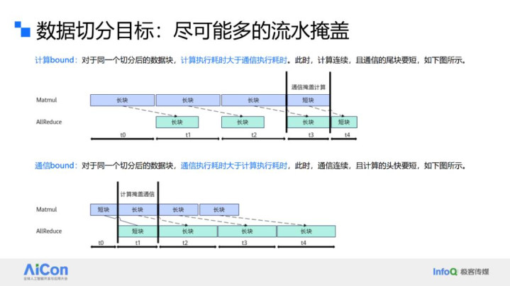 目前,虽然我们在通算融合方面已经做了一些工作,但仍有进一步优化的空间。在实际操作中,切分策略是一个关键因素。切分策略的选择与算子的实现密切相关。有些算子可能有专门的实现方式,这就需要我们根据具体情况来确定合适的切分方式。