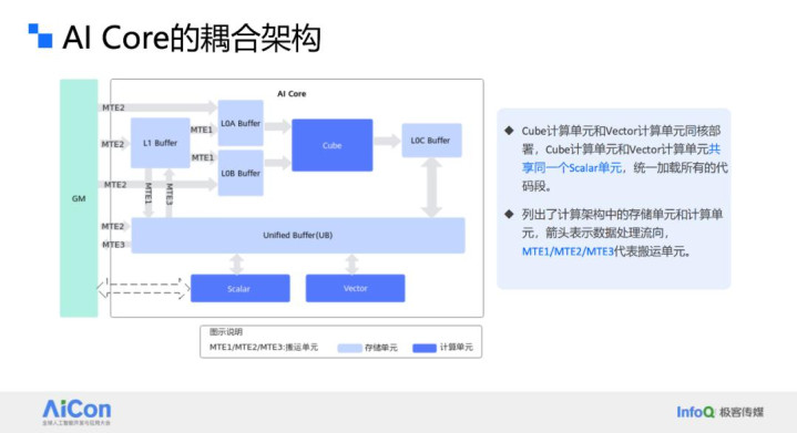 我介绍一下我们的 AI Core 架构。在奥特莱斯 300I 上,我们的架构如图所示,Cube 和 Victor 是同核部署的。一个 AI Core 包含 Cube 计算单元、Scala 单元和 Victor 计算单元。Cube 计算单元和 Victor 计算单元共享一个 Scala 单元,这种架构是耦合的,与 Atlas 800 A2 上的分离架构不同。