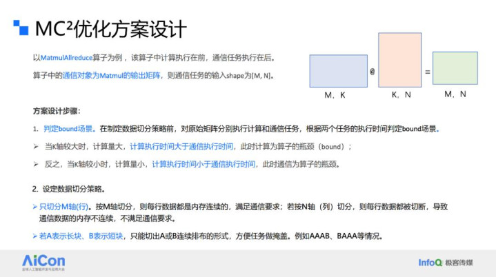 在实际优化过程中,我以 MatmulAllreduce 算子为例进行了深入探索。首先,通过分析原始矩阵的计算和通信任务,判定其 bound 场景。当 k 轴较大时,计算量大,执行时间大于通信时间,此时算子为计算 bound;而当 k 轴较小时,计算量小,执行时间小于通信时间,算子则为通信 bound。在设计数据切分策略时,我选择按行切分 m 轴,以保证每行数据的内存连续性,满足通信算法的要求。
