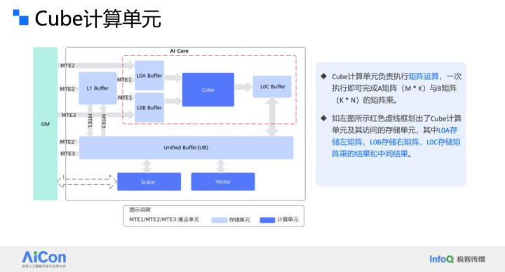 Cube 负责矩阵运算,在一个时钟周期内可以完成矩阵 m 乘 k 或矩阵 k 乘 n 的运算。其主要单元包括 L0A、L0B 和 L0C,分别用于存储左矩阵、右矩阵和结果矩阵或中间结果。